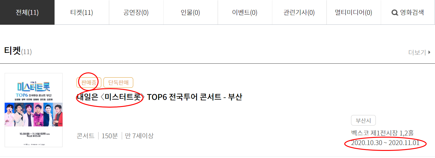 인터파크 티켓 홈페이지 접속 한후에 로그인을 하고 미스터트롯을 검색해줍니다~!
