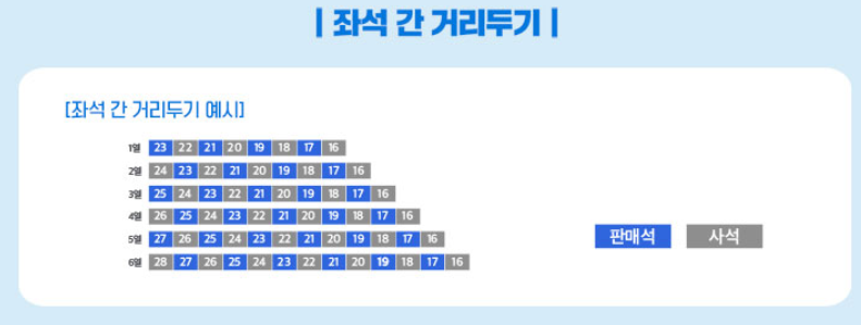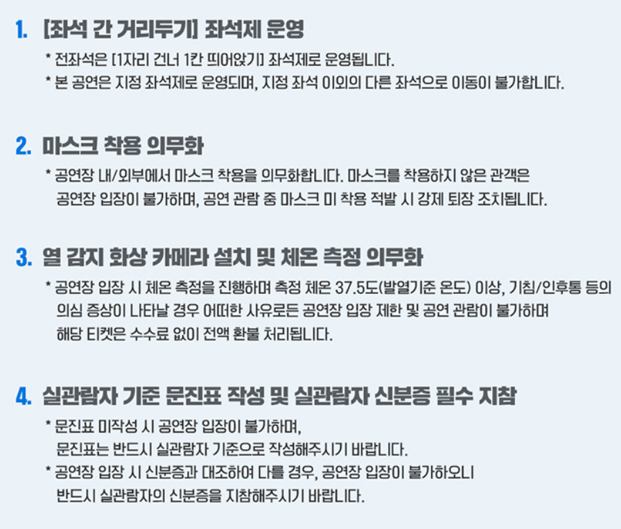 각종 방역수칙을 꼭 지켜야하며 좌석간 거리두기로 연속으로 좌석예매가 불가능합니다.