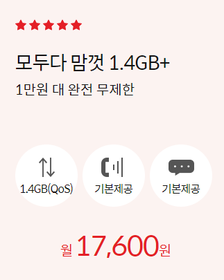 두번째 추천 요금제 모두다 맘껏 1.4GB+입니다. 요금제 이름과 같이 통화문자데이터 모두 무제한이며 기본제공데이터 1.4GB모두 소진시 1메가 속도로 무제한 이용가능합니다. 개인적으로 가장 가성비 뛰어난 요금제상품이지 않나싶은데요. 무제한 요금제로 데이터요금폭탄 맞을일도 없으며 주로 밖에서 데이터를 이용할때에는 인터넷서칭이나 카카오톡 이정도를 활용한다고 치면 월 1만후반대 가격으로 무제한은 정말 괜찮아 보입니다. 물론 1메가속도로 유튜브도 충분히 볼 수 있는 속도이긴 하죠. 가장 추천드리는 요금제 중 하나입니다.