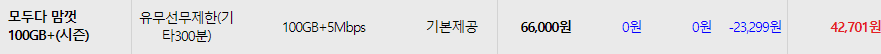데이터 : 100GB 소진시 5Mbps 속도 무제한