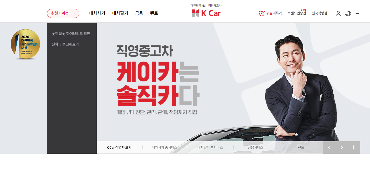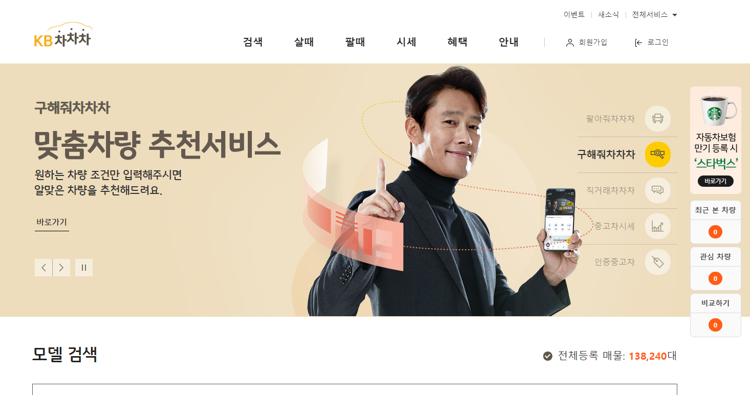 2017년에 출범한 KB차차차는 배우 이병헌씨가 모델으로 유명하죠! 현재 공격적인 마케팅으로 중고차 등록매물 수에서 꽤나 우위를 점하고 있으며 오랫동안 순위가 지속되고 있습니다.