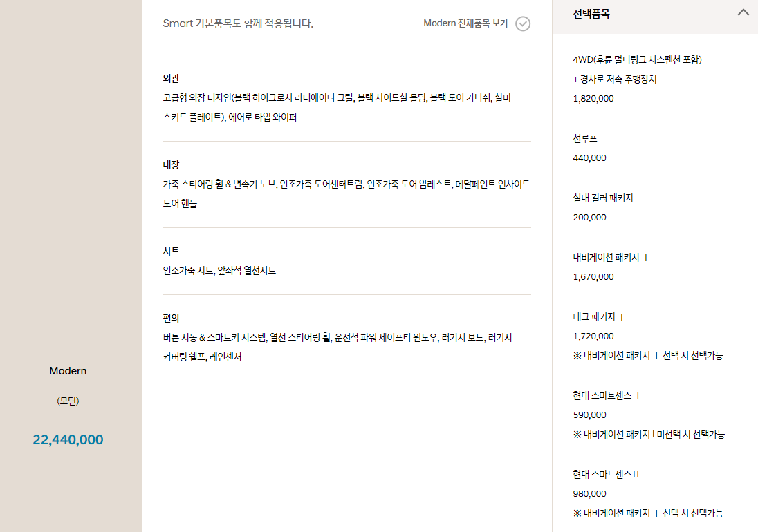 가격을 누르시면 트림별, 옵션추가별 가격대를 편하게 확인하실 수 있습니다! 위에서 제원도 확인할 수 있다고 말씀드렸는데요. 보기 쉽게 디자인되어 한눈에 확인할 수 있더라구요.