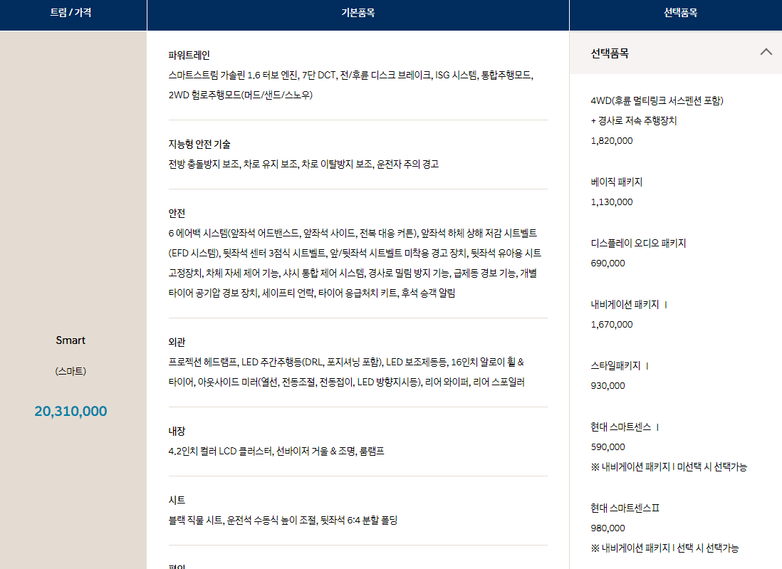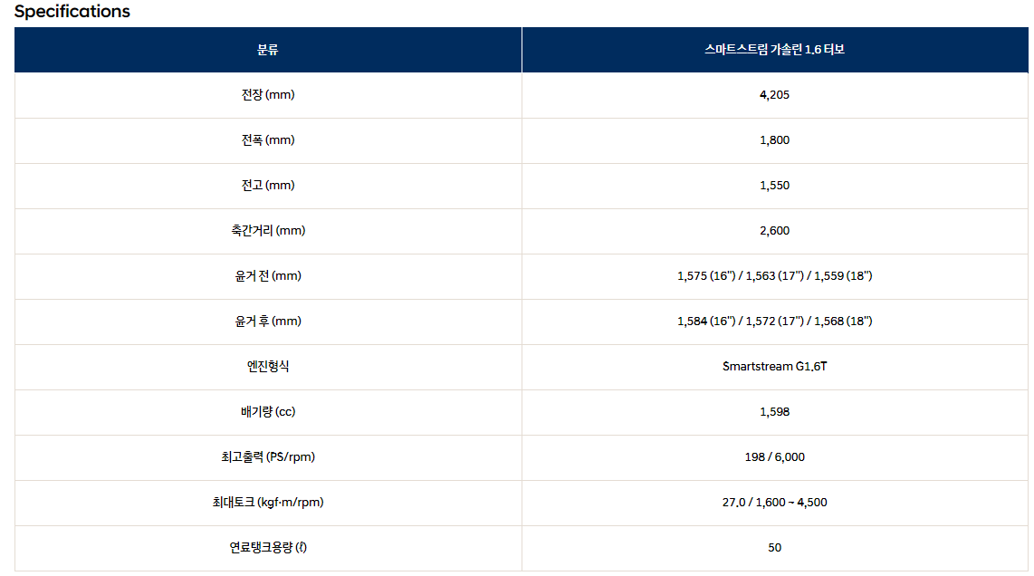 기본적인 배기량, 엔진형식, 출력, 토크, 전장, 전폭 등등의 제원 또한 확인할 수 있으니 현대홈페이지에서 확인하시는게 가장 좋을듯 싶습니다.