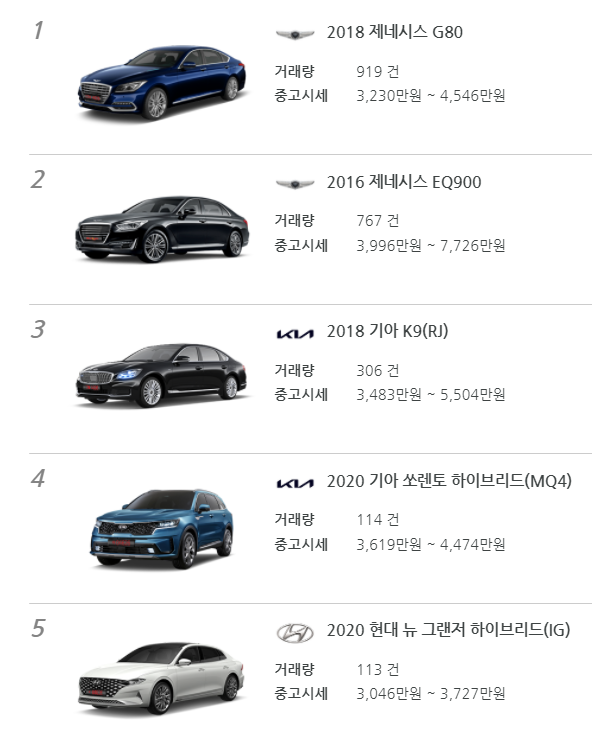 오우쒯, 제네시스 시리즈부터 18 기아K9, 그리고 20시리즈 쏘렌토 , 뉴그랜저 하이브리드 모델까지,, 최신모델들이 즐비합니다. 신차보다 오히려 이 구간부터는 잘만 구한다면 중고차가 더욱 경제적일 수도 있습니다.