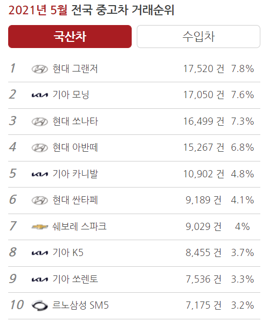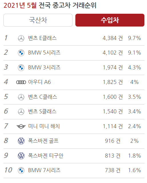 국산차는 당연히 현대와 기아차가 휩쓸고 있네요. 준중형세단 그랜저와 초심자가 타기 좋은 모닝에 이어 현대 쏘나타, 아반떼가 뒤를 잇고 있습니다. 거래순위가 왜 중요하냐면 그만큼 거래매물이 많다는 것으로 연결되기 때문이죠. 수입차를 보시면 벤츠 E클래스와 BMW 5시리즈가 20% 정도를 차지하고 있는 모습입니다. 개인적으로 E클래스 뿐만 아니라 C, S클래스도 매우 준수하다고 생각되므로 이것저것 잘 비교해보시기 바랍니다.