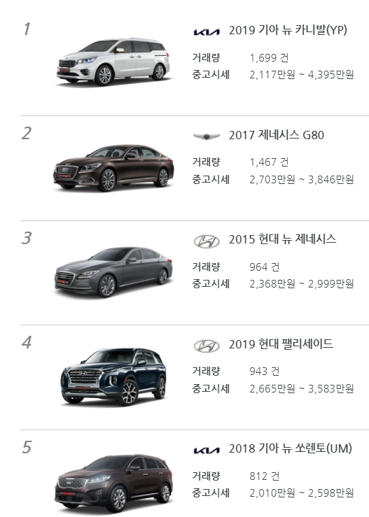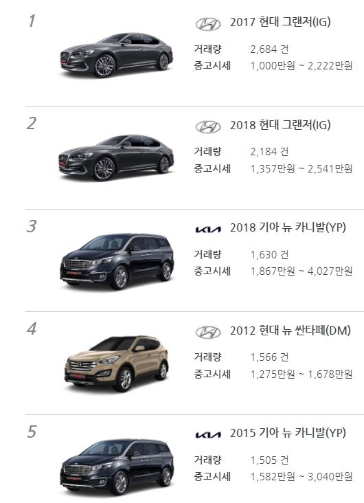 2천만이하부터는 중고차치고는 꽤나 가격대가 높다고 볼 수 있겠죠? 17,18 현대 그랜저, 18기아 뉴 카니발, 12 뉴 싼타페, 15 뉴 카니발 순으로 거래가 이뤄지고 있습니다. 대략적으로 준중형부터 오래된 대형차까지 2천~3천까지 포진되어 있는 모습입니다.