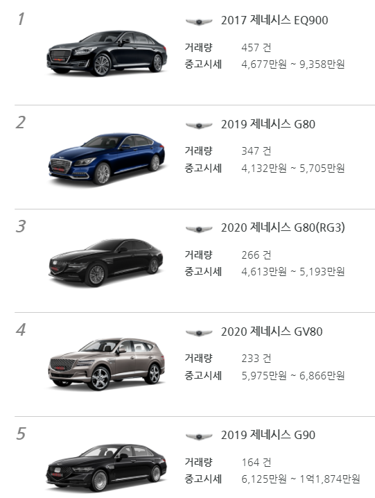 여기서부턴 최신 제네시스 모델이 즐비합니다. 4천을 넘어 1억을 호가하는 중고차도 있네요. 개인적으로 제네시스 GV80 한번 타보는게 소원입니다.