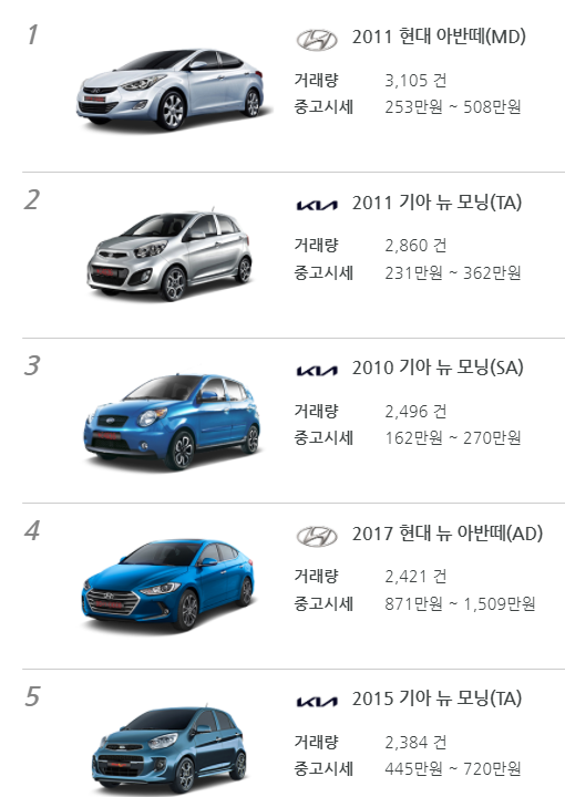거래건수별로 정리가 되어있는 모습입니다. 2011 현대 아반떼, 2011 기아 뉴모닝, 2010 모닝, 2017 뉴아반떼, 2015 뉴모닝이 뒤를 잇고 있습니다. 대략적으로 소형차들이 낮은 가격대를 차지하고 있는데요. 중고시세 편차가 큰만큼 성능기록부나 연식 등을 잘 비교하셔서 구매하셔야겠습니다.