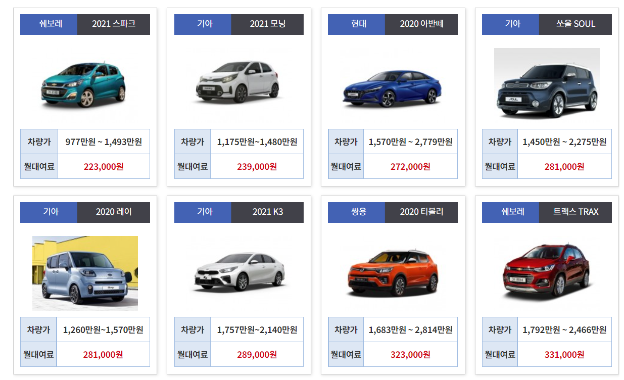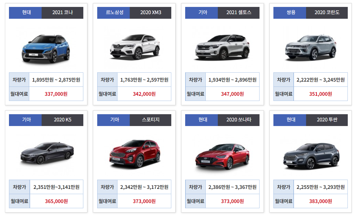 최신 기종을 보시면 30후반대까지 형성되어 있는 모습입니다. 2020쏘나타, 2020투싼이 37~38만의 월 대여료를 형성하고 있네요. 월대여료와 대여기간 계산하셔서 경제사정에 알맞게 선택하시면 되겠습니다.