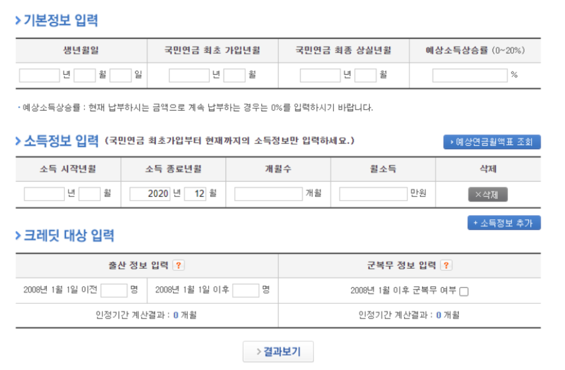 소득 및 가입기간을 입력하여 예상연금액을 알아보거나,