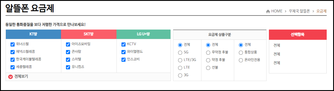 이 모든 요금제 비교는 우체국알뜰폰사이트에서 손쉽게 할 수 있습니다. 이렇게 5G, LTE 등등 설정을 통해 나에게 알맞는 알뜰폰 요금제를 찾을 수 있으니 참고바랍니다.